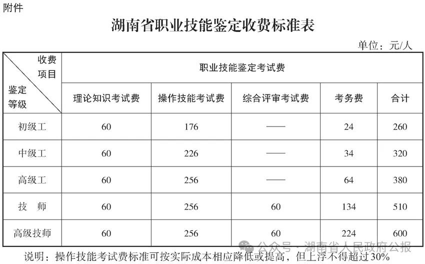 附件:湖南省職業(yè)技能鑒定收費標準表