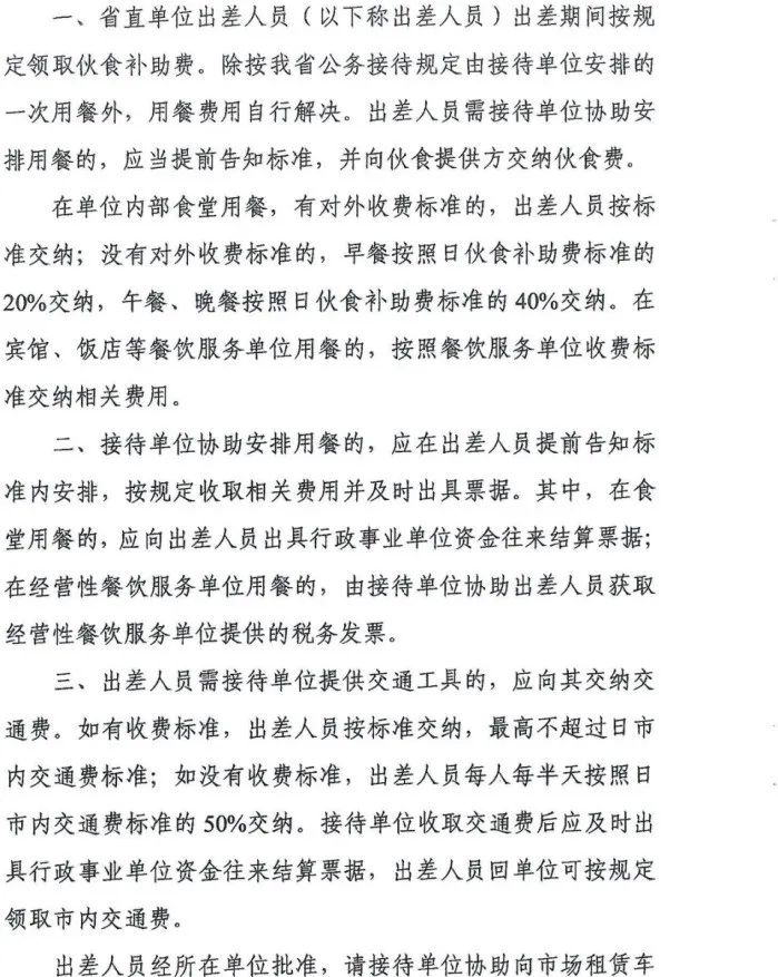 此外,《通知》要求省內各地結合本地區(qū)實際,制定本地區(qū)出差人員差旅伙食費和市內交通費收交管理規(guī)定。各省直黨政機關、事業(yè)單位可根據《通知》要求,制定本單位差旅伙食費和市內交通費交納、報銷具體操作規(guī)定。