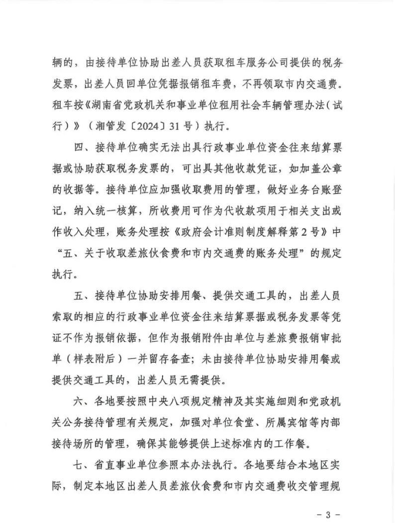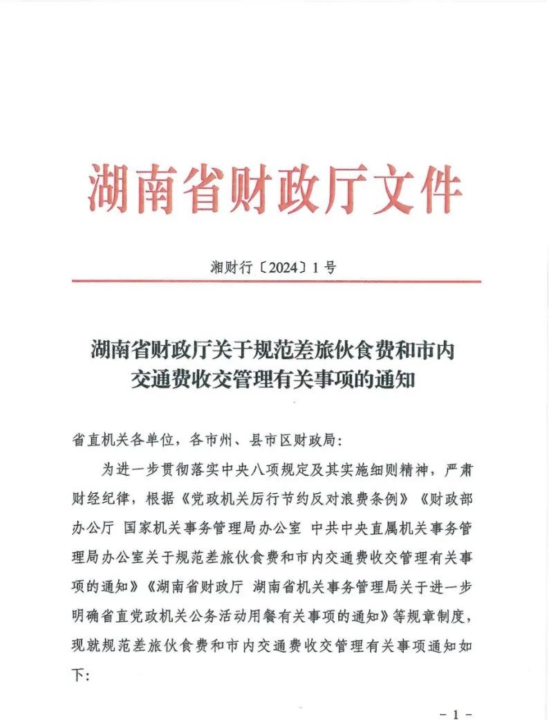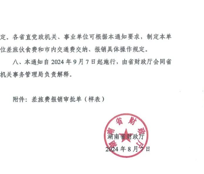 為進一步規(guī)范省直單位差旅費管理,嚴肅財經紀律,近日,湖南省財政廳印發(fā)《關于規(guī)范差旅伙食費和市內交通費收交管理有關事項的通知》(湘財行〔2024〕1號,以下簡稱《通知》),在《湖南省省直機關差旅費管理辦法》基礎上,對差旅伙食費和市內交通費收交管理作了進一步明確,規(guī)定自9月7日起,省直單位出差人員在接待單位協(xié)助安排用餐和用車情況下,須嚴格按規(guī)定,分類依標準交納差旅伙食費和市內交通費。