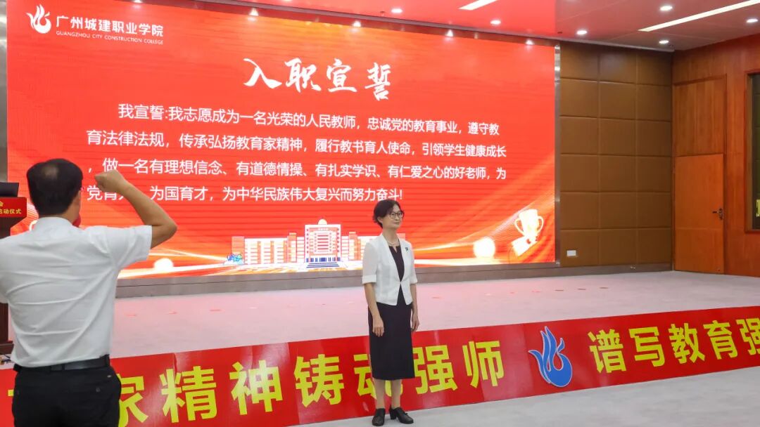 在鄢維峰的領(lǐng)誓下,黃學(xué)茭監(jiān)督新入職教師進(jìn)行宣誓。莊嚴(yán)的誓言中,深刻表達(dá)了踐行教育家精神,投身教育事業(yè)、恪守教師職業(yè)規(guī)范的堅(jiān)定承諾。