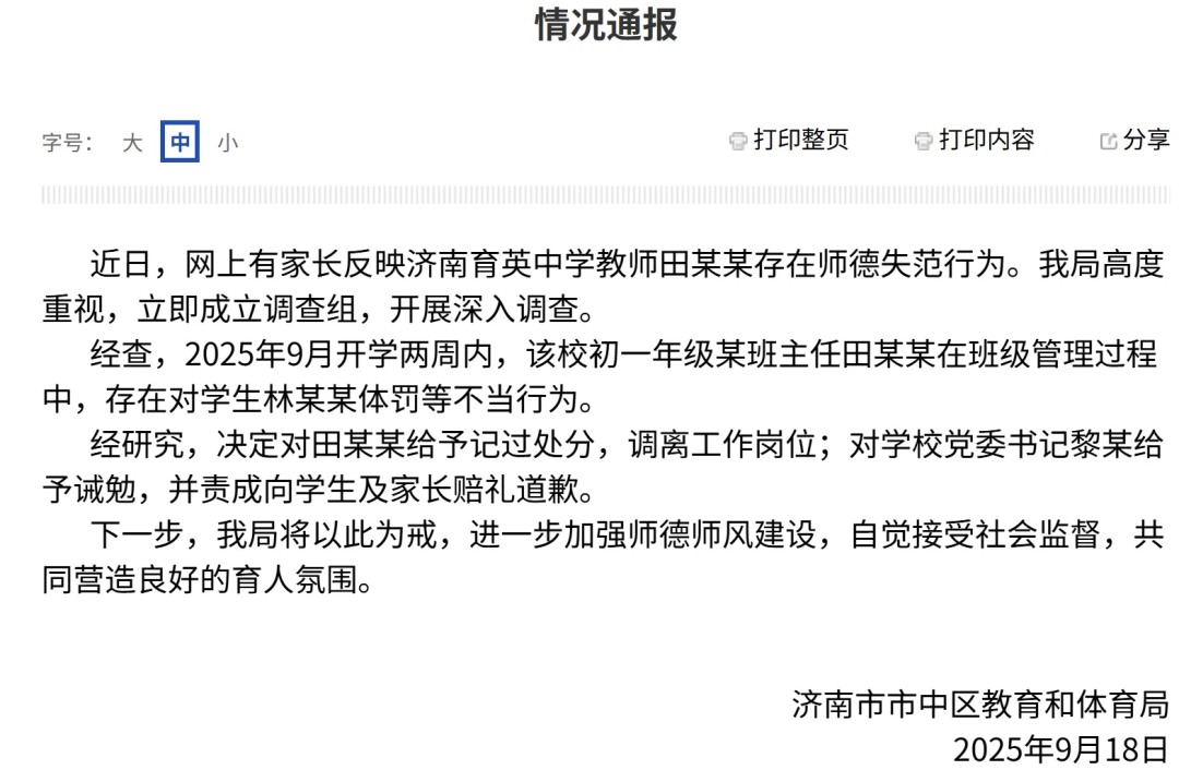 近日,網(wǎng)上有家長反映濟(jì)南育英中學(xué)教師田某某存在師德失范行為。我局高度重視,立即成立調(diào)查組,開展深入調(diào)查。