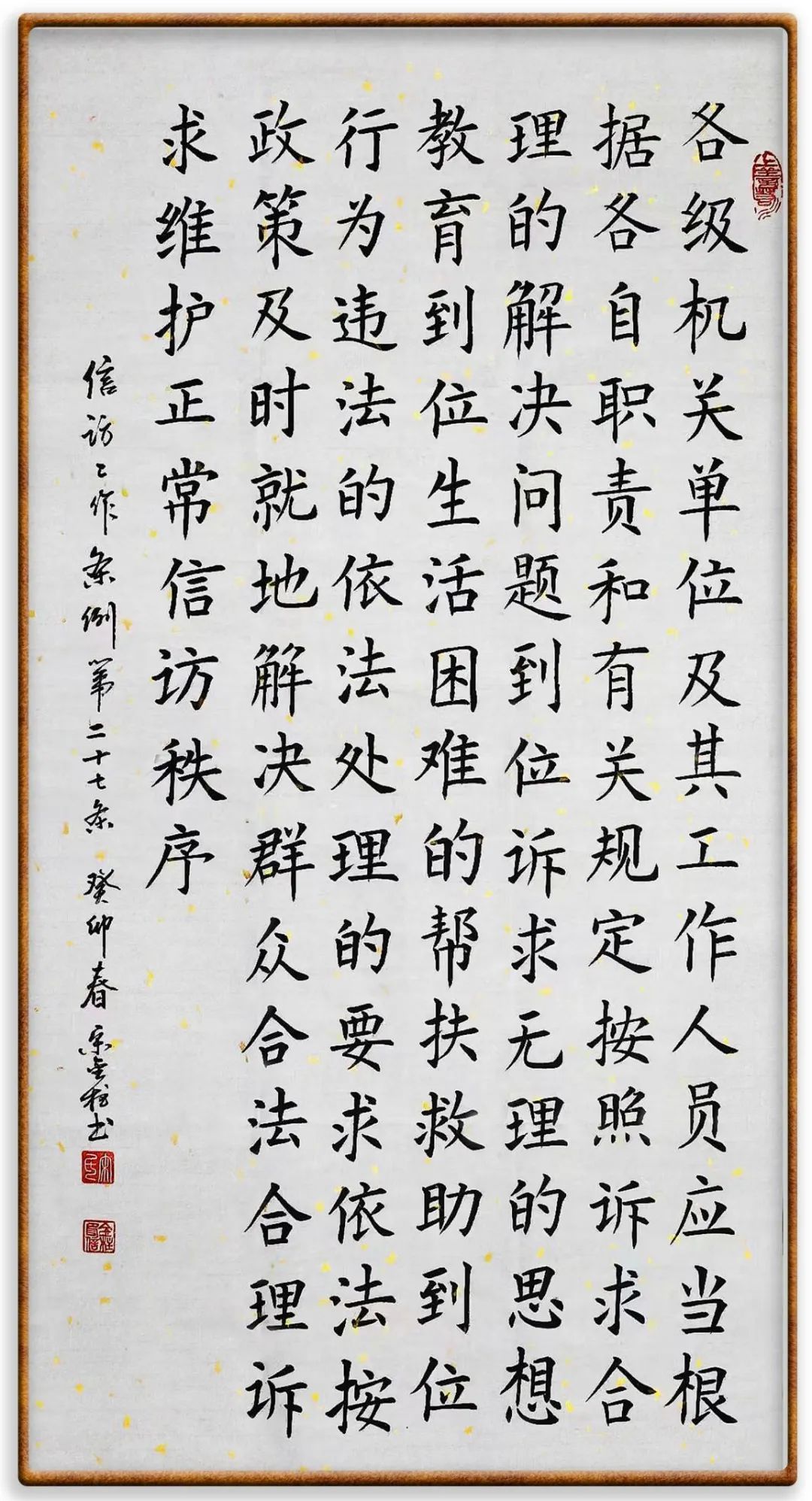 第二十七條 各級機(jī)關(guān)、單位及其工作人員應(yīng)當(dāng)根據(jù)各自職責(zé)和有關(guān)規(guī)定,按照訴求合理的解決問題到位、訴求無理的思想教育到位、生活困難的幫扶救助到位、行為違法的依法處理的要求,依法按政策及時(shí)就地解決群眾合法合理訴求,維護(hù)正常信訪秩序。