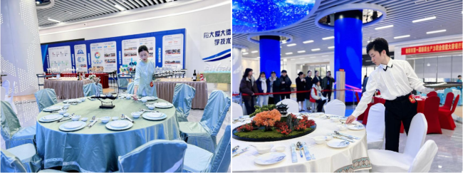 圖五:參賽選手羅嘉慧(優(yōu)勝獎(jiǎng))、凌生宇(優(yōu)勝獎(jiǎng))中餐宴會(huì)擺臺(tái)現(xiàn)場(chǎng)