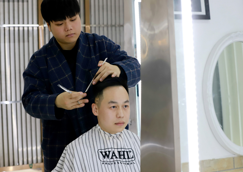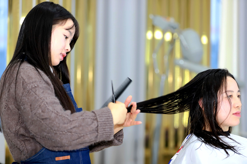 學(xué)生們熱情迎接老師就座,拿上工具,使出自己所學(xué),開始為老師們洗剪吹。三個小時的體驗時間,老師們看著鏡子中的自己,對學(xué)生的手藝非常滿意,李玉老師說,從來沒想過自己在學(xué)校就能親身體驗學(xué)生們的服務(wù),感受到孩子們的愛,一切的付出都是值得的。