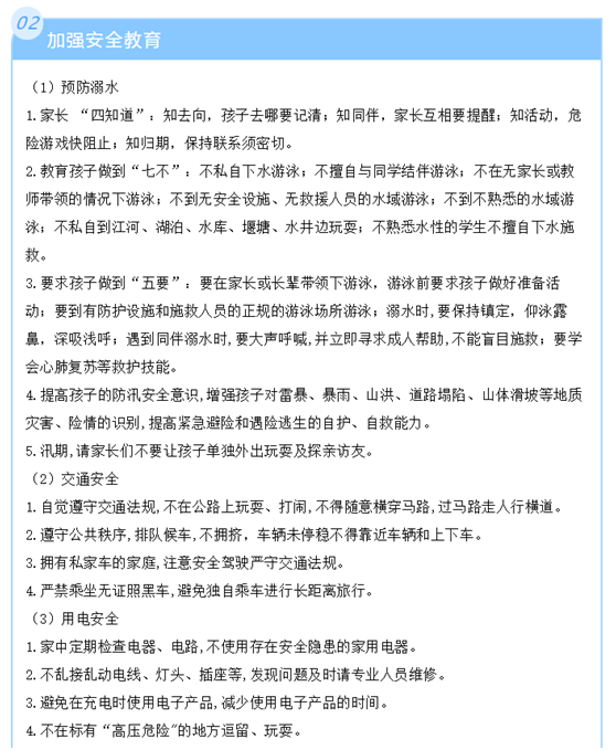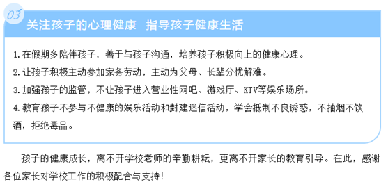 您好!署假即將開始。首先,感謝您為孩子的成長所做出的不懈努力,感謝您對學校工作的理解、支持和配合!為持續(xù)開展對孩子的養(yǎng)成教育,讓您的孩子過一個安全、愉快而有意義的假期,現提出以下幾點建議和要求: