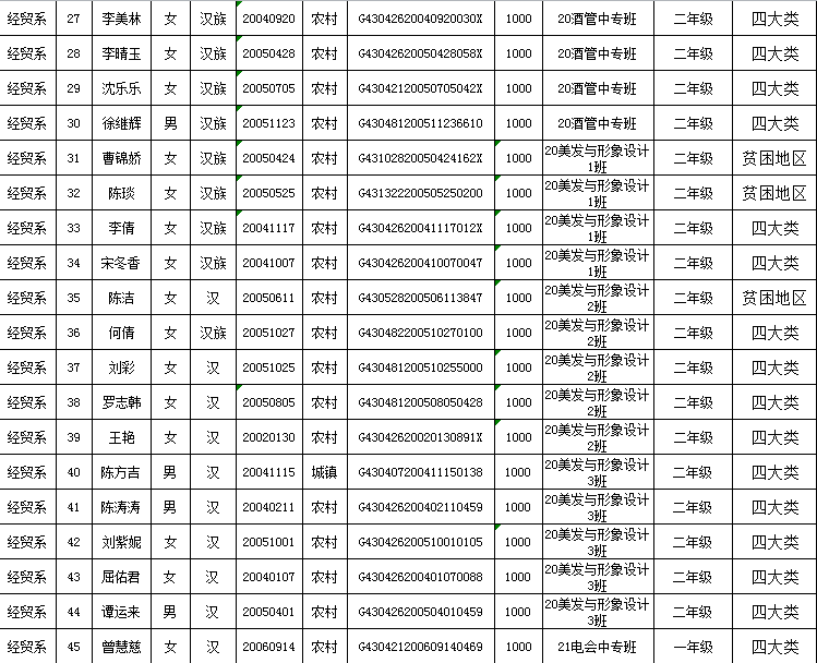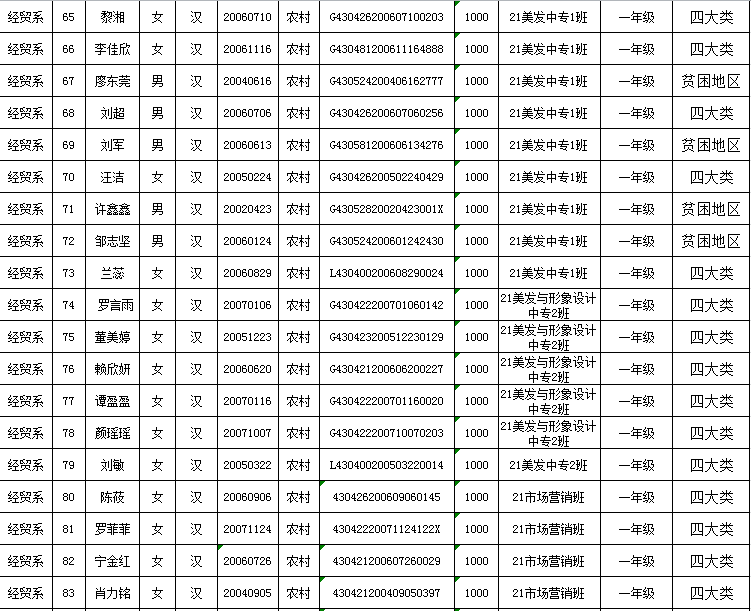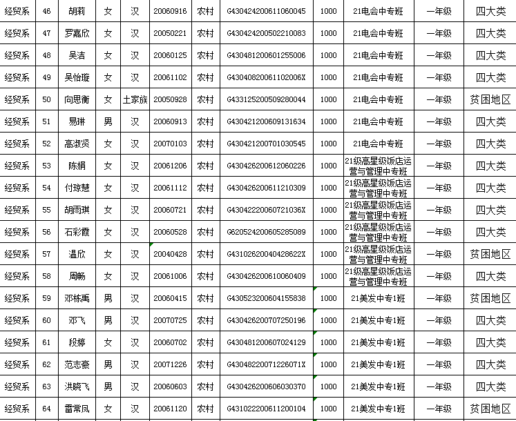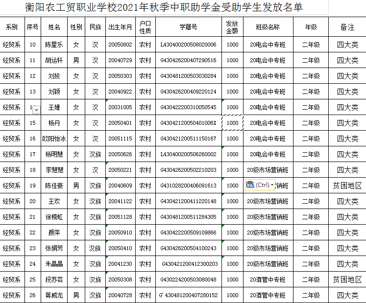 衡陽農工貿職業(yè)學校經(jīng)貿系2021年度秋季助學金評定名單公示
