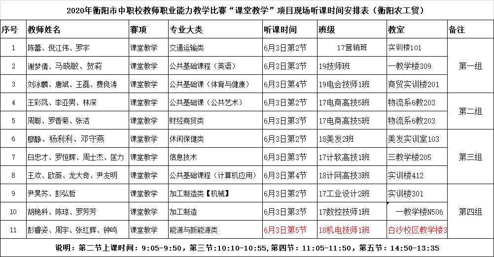 2020年衡陽市教師職業(yè)能力比賽-課堂教學比賽采用現(xiàn)場聽課方式,現(xiàn)定在6月3日到我校聽課,請各系(院)部通知下表中教師(組),做好參賽準備,按說明要求把聽課班級、教室地點等信息于5月30日報給教務處羅伏力。