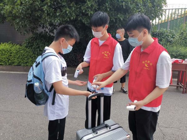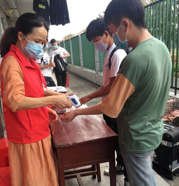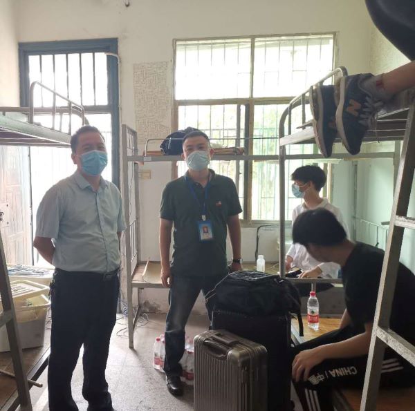 在男生宿舍1棟,參與志愿服務(wù)活動(dòng)的教師對(duì)返校同學(xué)進(jìn)行體溫檢測(cè)及消毒,查看并勸導(dǎo)學(xué)生戴好口罩,不串門(mén),搞好宿舍及個(gè)人衛(wèi)生,確保返校師生的安全和健康。
