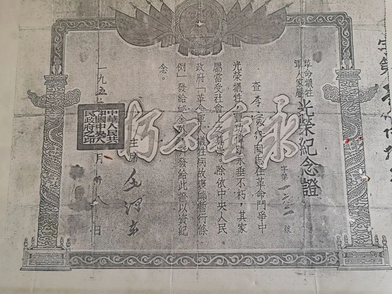 李實行犧牲軍人光榮紀(jì)念證