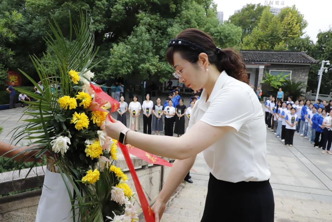 學(xué)院黨委委員、副院長肖芳整理花籃上的緞帶