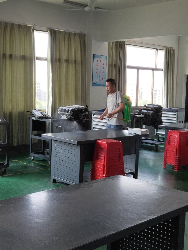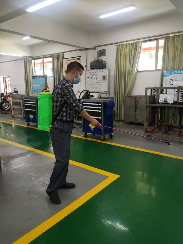 為貫徹落實學(xué)院開學(xué)疫情防控方案,順利開展實訓(xùn)教學(xué),實訓(xùn)中心明確要求所有工作人員,繃緊疫情防控這根弦,夯實各自的工作職責(zé),慎終如始的把工作抓嚴(yán)做實做好。每天對所有實訓(xùn)場地消毒兩次,管理員親力親為,按時消殺。圖為各實訓(xùn)工場管理員每天分中午、下午兩個時段在做實訓(xùn)場地、設(shè)備的消毒工作。