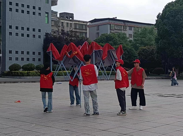 前期準(zhǔn)備階段志愿者們認(rèn)真做好招聘會會場的各項布置工作,搬桌椅、搭帳篷、擺旗幟等,志愿者們各司其職積極投入志愿服務(wù)。