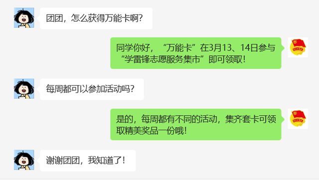 每周可兌換一項(xiàng)活動指定卡片,參與校內(nèi)外志愿活動者在活動結(jié)束后即可領(lǐng)取活動卡片,集齊學(xué)院活動套卡(共7張,萬能卡可當(dāng)任意卡使用)后,可前往指定地點(diǎn)兌換特別禮品一份。