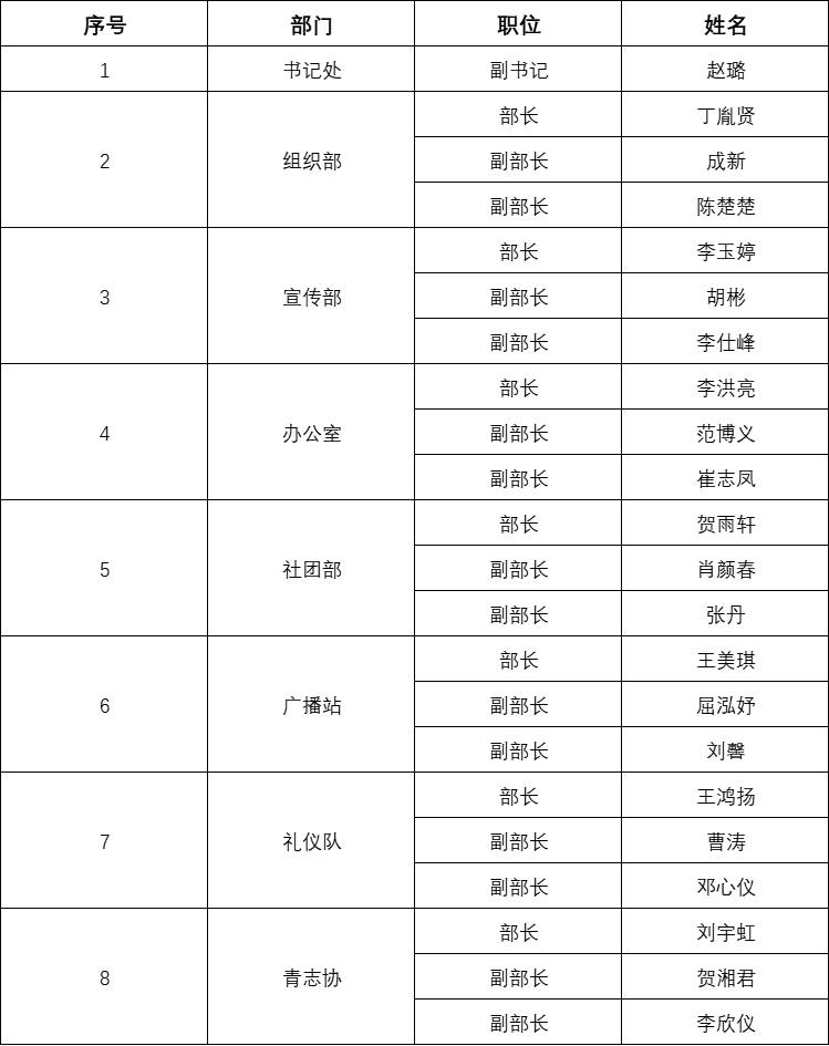 備注:公示期結(jié)束后,若無(wú)異議,團(tuán)委將對(duì)通過公示的學(xué)生團(tuán)干開展為期三個(gè)月的試用期考察。試用期結(jié)束后,正式予以聘任。