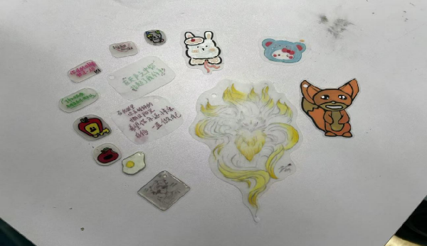 課程現(xiàn)場(chǎng)氛圍熱烈,學(xué)員們興致盎然。在導(dǎo)師的細(xì)致指導(dǎo)下,大家紛紛拿起畫(huà)筆勾勒創(chuàng)意圖案,用剪刀裁剪出心儀造型,再通過(guò)熱風(fēng)槍見(jiàn)證熱縮片“縮水”定型的奇妙過(guò)程。從簡(jiǎn)單的卡通形象到精致的花紋設(shè)計(jì),一張張普通的熱縮片在學(xué)員們的指尖逐漸變成鑰匙扣、掛件、書(shū)簽等精美作品?!暗谝淮巫鰺峥s片,看著自己畫(huà)的小圖案慢慢收縮變立體,真的太神奇了!”一位學(xué)員拿著剛完成的作品,滿(mǎn)臉成就感地說(shuō)道。