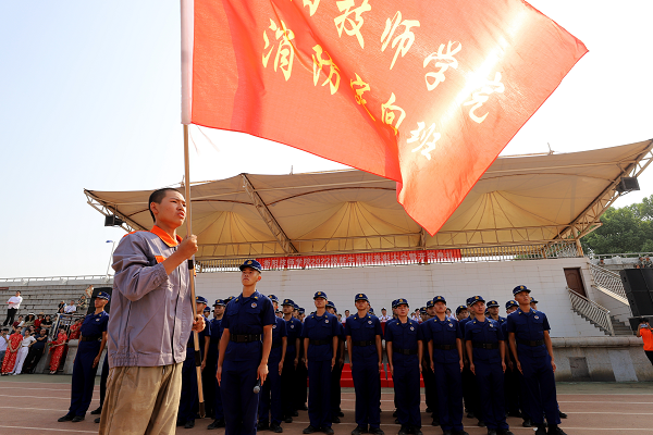 大會上,2021級消防救援專業(yè)定向班學員向2022級意向班傳遞班旗,全體領導現(xiàn)場為消防救援專業(yè)定向班隊員佩戴紅花。
