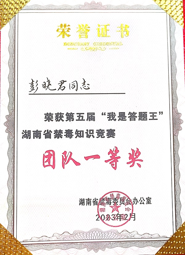 榮獲第五屆“我是答題王”湖南省禁毒知識競賽團隊一等獎