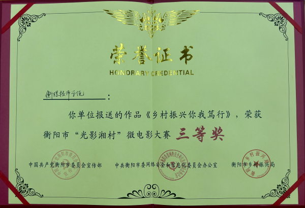 11月8日,從衡陽市“光影湘村”微電影大賽頒獎儀式上傳來喜訊,衡陽技師學院拍攝的作品《鄉(xiāng)村振興 你我篤行》榮獲大賽三等獎。