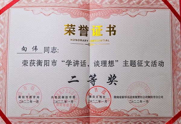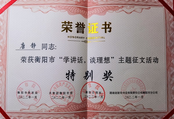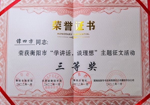 本網(wǎng)訊 3月11日,衡陽市黨史學(xué)習(xí)教育理論征文暨“學(xué)講話,談理想”主題征文評選活動結(jié)果揭曉,我院師生作品喜獲特別獎1項,二等獎1項,三等獎1項,充分展現(xiàn)了學(xué)院黨史學(xué)習(xí)教育的優(yōu)秀成果。