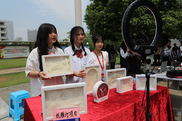 “歡迎各位小伙伴們來到我們時光漫影小店的直播間,今天帶來了我們同學(xué)自己手工制作的光影藝術(shù)燈‘紙雕燈’......”學(xué)院信息與生物技術(shù)系學(xué)生許欣怡、鄭淑芳、曾琪化身“主播”,現(xiàn)場直播介紹紙雕燈項目,吸引不少初中生在技能特色展示區(qū)駐足圍觀,贏得現(xiàn)場陣陣贊嘆。