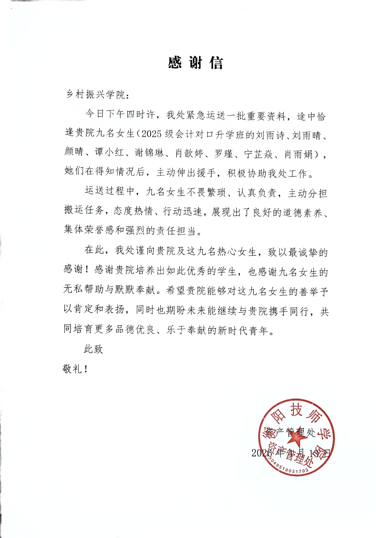 本網(wǎng)訊 近日,援引資產(chǎn)管理處送來感謝信——我院2025級會計事務(wù)對口升學(xué)班劉雨詩等9名學(xué)生主動幫助資產(chǎn)管理處工作人員運送一批重要資料。工作人員對我院9名學(xué)生的主動作為表示感謝,特送來感謝信。