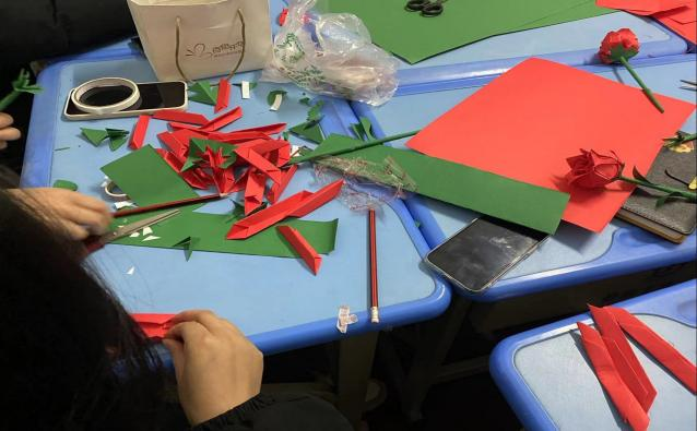 折紙花,是一種古老而優(yōu)雅的藝術(shù)形式。為了準(zhǔn)備這份溫馨的禮物,同學(xué)們提前學(xué)習(xí)了折紙花的技巧,并用心挑選了各種顏色的紙張。在學(xué)習(xí)活動中,他們?nèi)褙炞⒌卣郫B、裁剪,將對女性老師的敬愛與感激之情融入每一朵折紙花中。