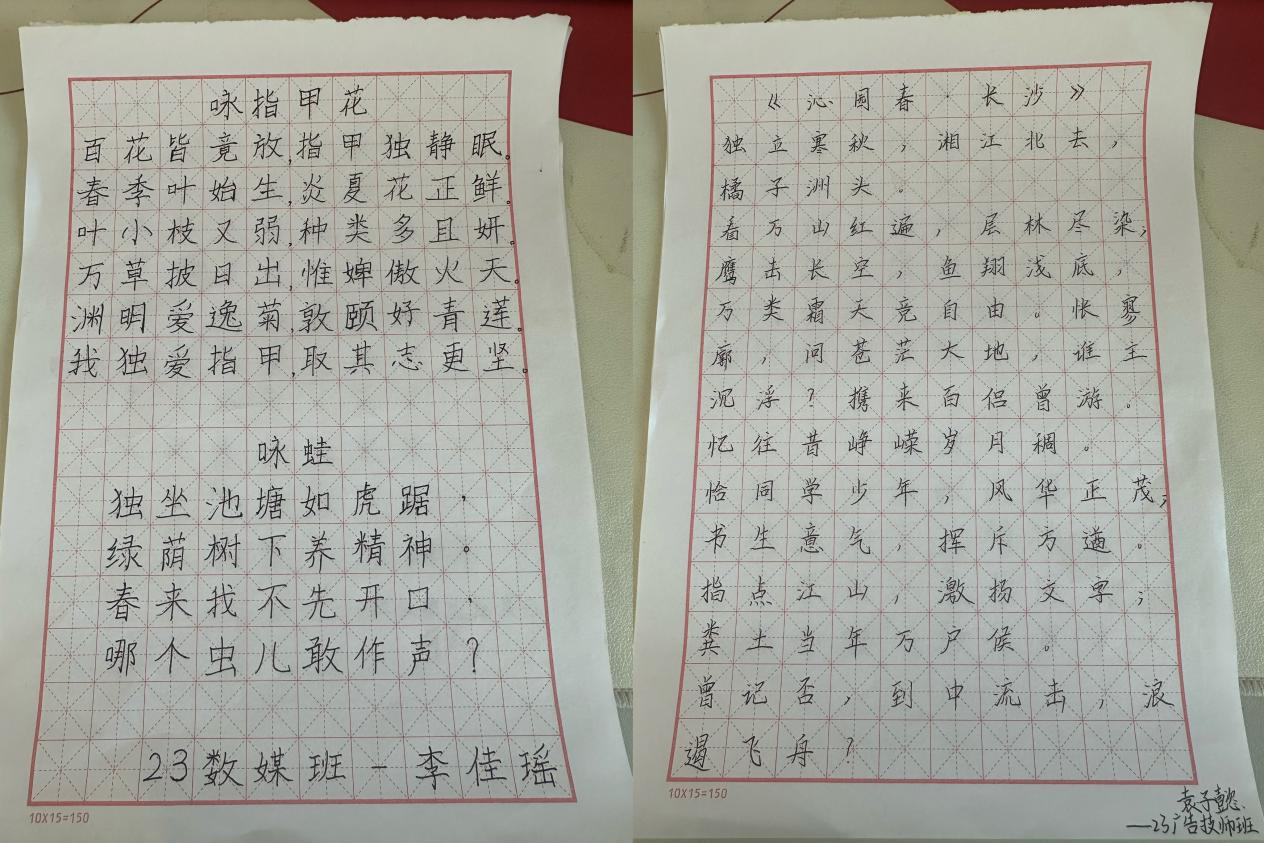 各班級同學踴躍參加本次活動,通過閱讀毛澤東的詩詞,進一步從中領會、感悟毛澤東精神,選取自己喜愛的詩詞書寫成一張張硬筆和毛筆作品交于學院評選。