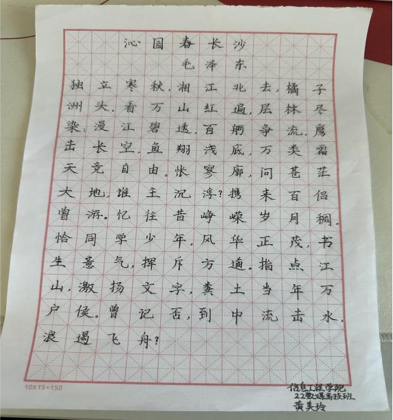 為深入學習貫徹習近平新時代中國特色社會主義思想,紀念毛澤東同志誕辰130周年,緬懷偉人及其豐功偉績,培養(yǎng)學生愛黨愛國主義情懷,活躍校園文化生活,信息工程學院于2023年11月8日至11月27日期間,組織全院學生報名參加了紀念毛澤東誕辰130周年系列活動——毛澤東詩詞書法比賽。