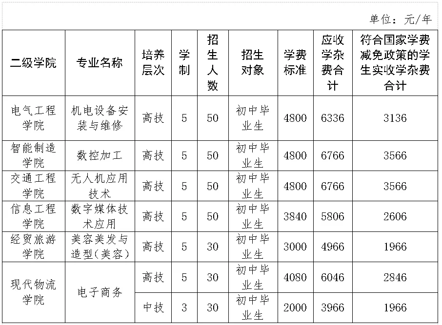1.報讀中技層次且符合國家學(xué)費減免政策的學(xué)生免交學(xué)費,報讀高技層次且符合國家學(xué)費減免政策的學(xué)生在此標(biāo)準(zhǔn)上減免學(xué)費1600元/期后按差額交學(xué)雜費;